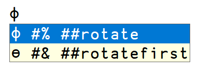 After setting the prefix introducer key to # (octothorpe / hash), pressing twice and typing “rot” shows suggestions for the glyphs and with the keywords “rotate” and “rotatefirst”.